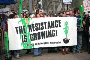 Militarization is the process of making society believe that violence, especially war, is an effective way to solve conflict to the point that any nonviolent attempt to solve conflict is snidely dismissed as ineffective, liberal, feminine, sissy or a whole host of other derogatorily used terms. The global problem of militarization takes different forms in every country, and even within each community. In Israel and Palestine troops attack women protesting the occupation. In Colombia women are participants and victims of violence perpetrated at every level of society. In Uganda those participating in the Walk to Work protest have been met with tear gas and bullets by the government’s security forces. I should be upfront here and say flat-out that I am very far left in my ideas of effective government: I don’t believe in borders or states. Imagine if the $553 billion defense bill just approved by the House was money spent on education, or healthcare, or ending violence….