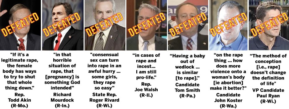 The “Legitimate Rape” Republicans this year saddled the American people with an onslaught of outrageous policies like demanding proof that a disabled rape victim show evidence of physically fighting off her attacker. From suggesting women should be paid less, to not reauthorizing the Violence Against Women Act, to voter fraud, to flat-out denying abortions to raped women in war and raped women soldiers, to the party platform calling for a constitutional ban on abortion, to calling conception from rape a gift from God, to denying birth control on the basis of religion, to claiming breast milk “cures” homosexuality, to making it legal to kill abortion providers the GOP really went off the deep end. The joke has made its way around the internet since November 6th but it’s true: When someone says, “The rape guy lost,” and you have to ask, “Which one?” your party is in trouble.