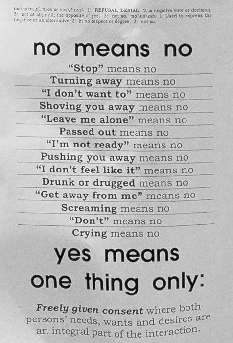 The restricting of access to abortion and sexual assault both serve one purpose–to control women by controlling their bodies. For women in the United States and around the world to be well, to be whole, equal and productive citizens women must first have the right to control their own bodies. The right to say no to unwanted physical contact and the right to make informed decisions about what medical procedures we choose to undergo are basic human rights. If I have sex and get pregnant and do not want to continue to be pregnant, I have the right to terminate the pregnancy because my body is mine alone and the responsibility for caring for the pregnancy would be mine alone. If I am a stranger, if I say no, if I stay silent, if I am crying, you have no right to my body. Consent is sexy and only an emphatic YES! means yes.