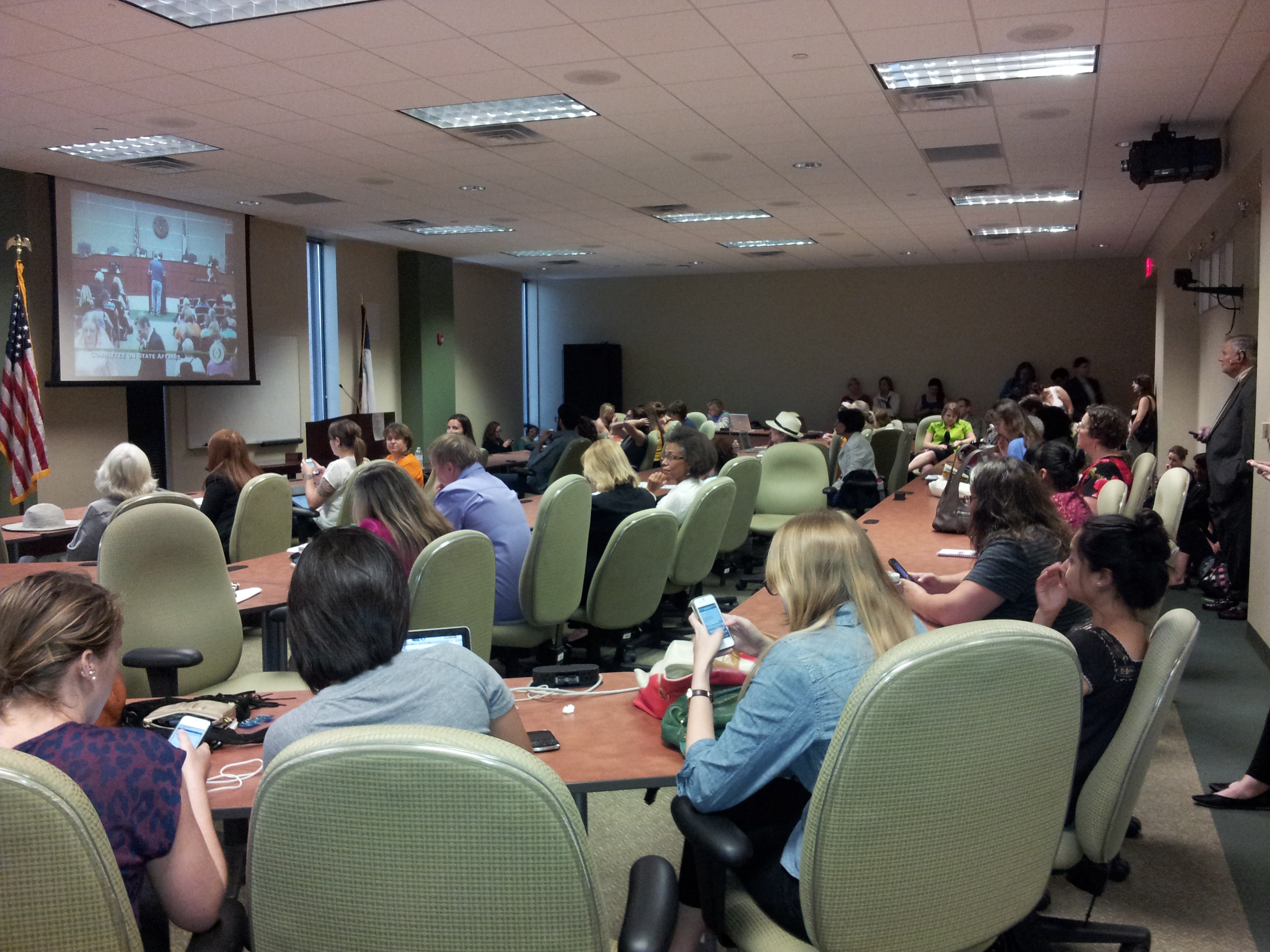 The discussion had started with House Dems debating whether they were dealing with calendar days or legislative days, to which Austin’s own RH Reality Check Reporter Andrea Grimes tweeted, “We can laugh about counting calendar days, but when #txlege outlaws birth control, that’s a skill we’ll all need to bone up on. #hb60.” The House didn’t reconvene until around 6:30pm, I think. So I gathered with the raucous bunch in the auditorium overflow room, which was just as well, since we didn’t have to abide by decorum.